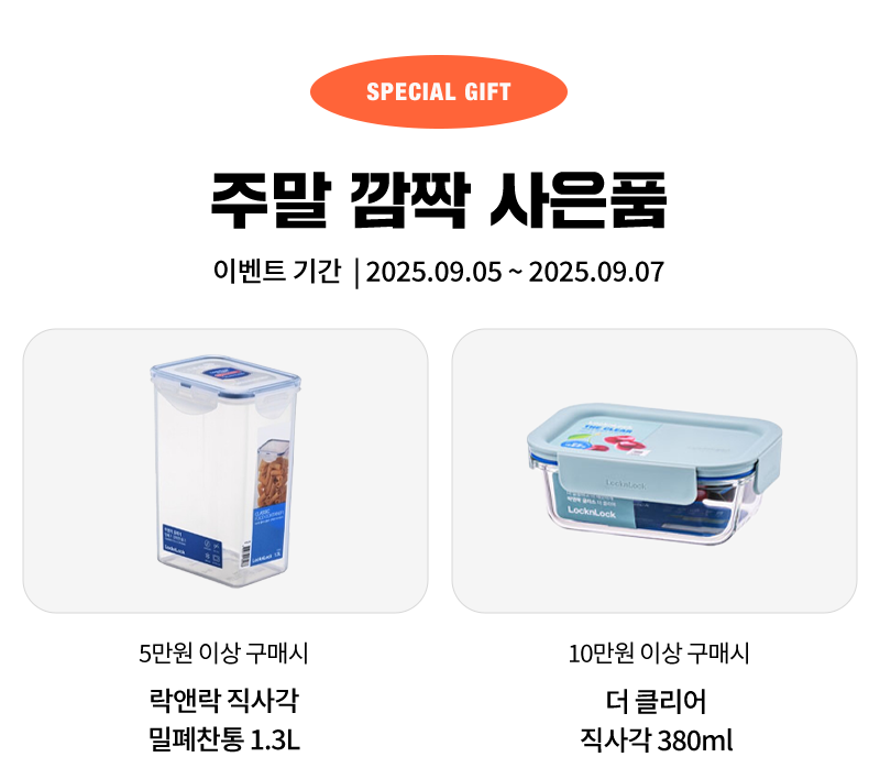 • 본 이벤트는 실 결제금액(배송비 제외) 5만원/10만원 이상 주문건에 한하여 사은품이 지급됩니다.
