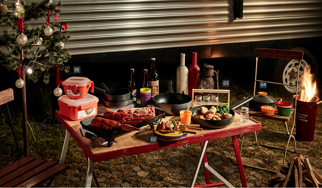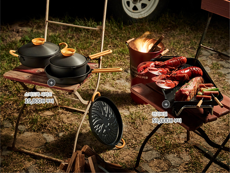 요즘은 그릴이 갖춰져 있는 곳도 있고, 그릴이 없는 곳도 있어서 그릴이 없어도 고기를 맛있게 먹을 수 있도록 조리도구를 구비하는게 좋아요~ 스피드쿡 시리즈는 열전도율이 좋아서 빠른 조리가 가능하고, 그릴이나 버너가 없을 때, 캠핑장에 전기 꽂을 곳만 있으면 바로 고기를 구울 수 있는 전기 그릴도 구비해 두면 좋아요~