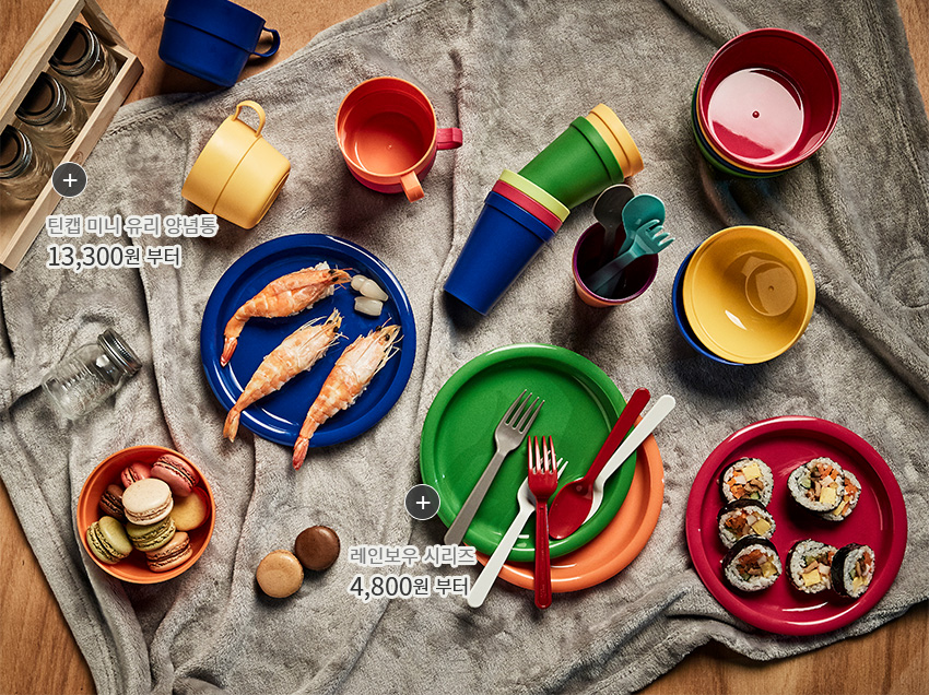 야외에서 음식을 맛있게 조리했는데, 담을 그릇은 있어야겠죠? 일반 식기는 이동하면서 깨질 위험이 있기 때문에 떨어뜨려도 잘 깨지지 않는 소재의 식기를 사용하는 것이 좋아요. 레인보우 시리즈는 가볍고, 휴대가 간편해서 캠핑이나 등산 시 사용하기 편리하고, 캠핑 시 조리할 때 조미료 등은 부피가 작은 미니 유리 양념통세트에 보관하면 좋아요~!