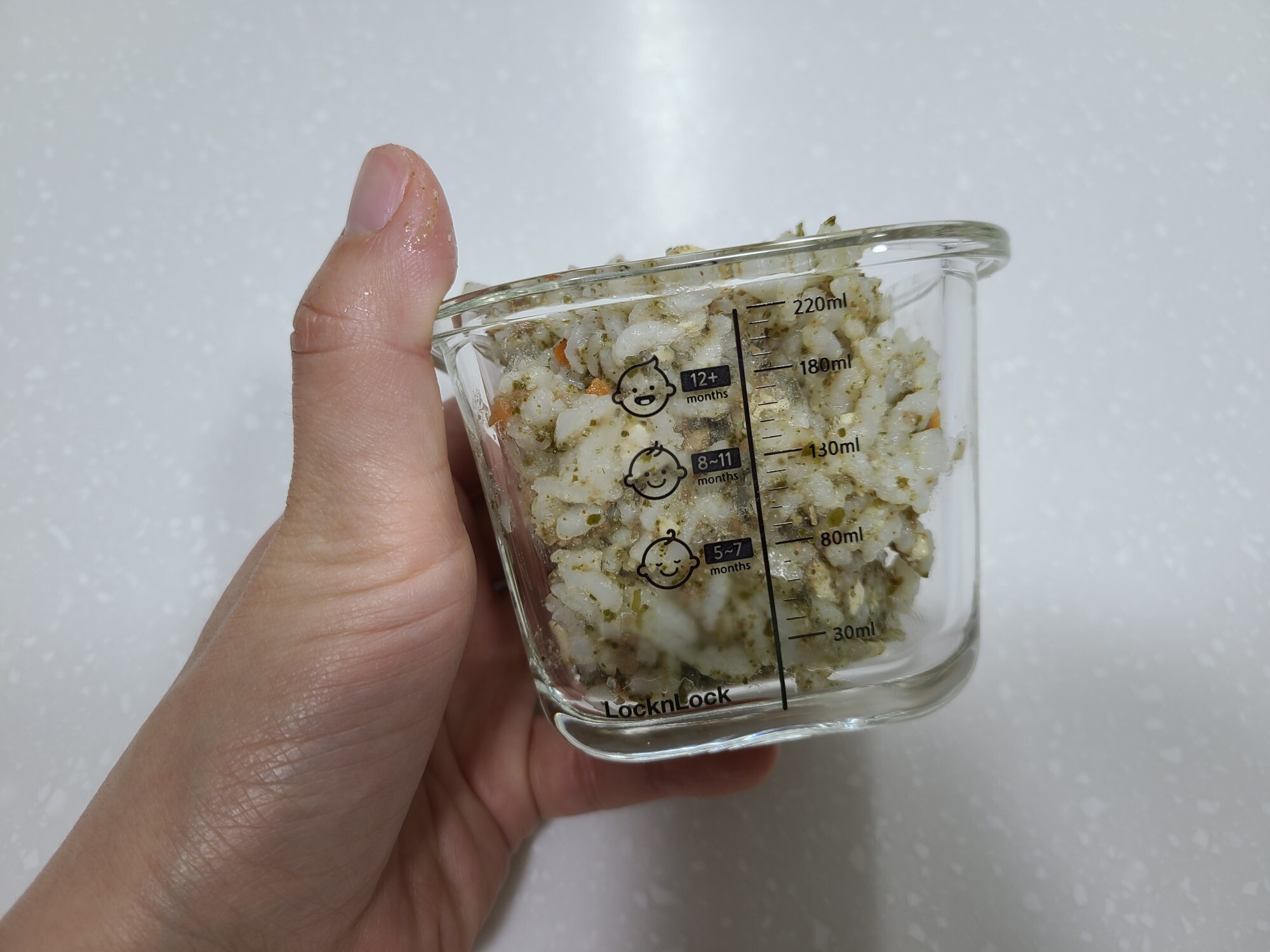 짜잔 울 아기 진밥 완료기 이유식을 이유식용기에 담아봤어요.