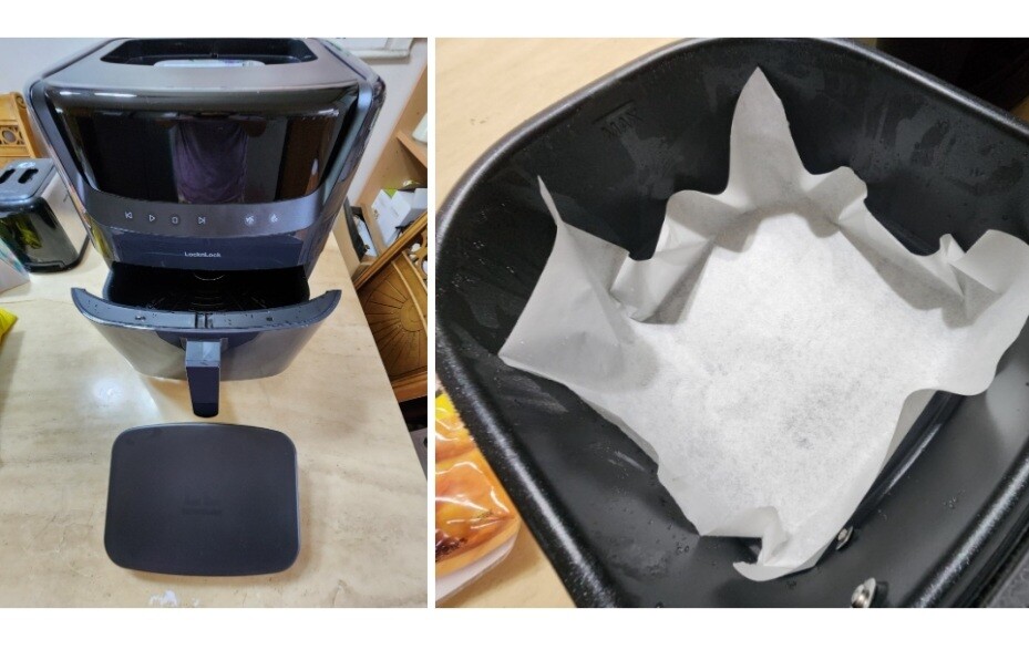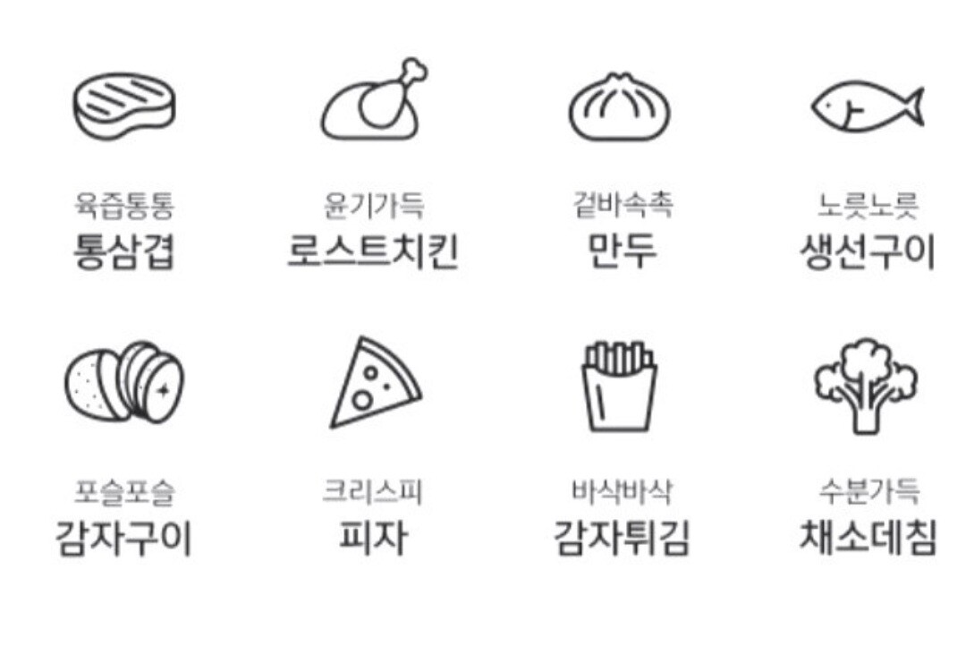 원버튼 자동요리 기능이 있어 버튼 하나만 누르면 그 요리를 최적의 상태로 시간과 온도가 설정되어 요리해준다. 자동메뉴 8종은 너무 쉽다. 중간에 알림소리가 나면 바스켓을 열어 뒤집어 주기만 하면 끝.