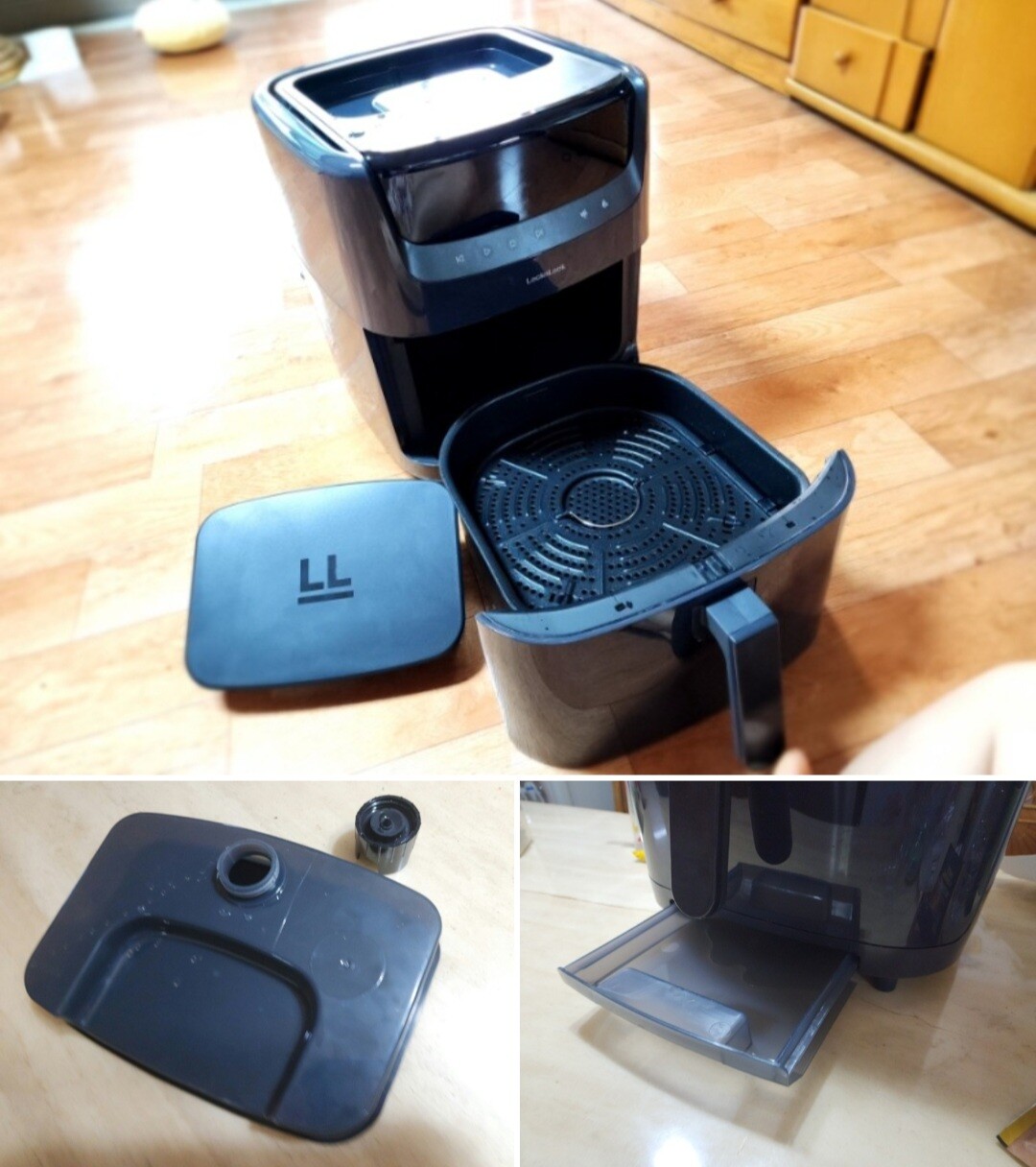 락앤락 스팀에어프라이어는 스팀청소, 기능이 있어 스팀으로 내부를 세척해서 배출하고, 배수 기능이 있어 물통안의 물이 빠지면 물받침을 비워 닦아내면 청소 끝.