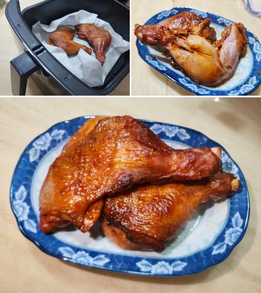 생닭 600g 한 마리를 원버튼 자동요리 기능을 이용하여 '윤기가득 로스트치킨' 버튼 47분이면 된다는데 꼭 다음에 해봐야겠다. 오늘은 시판되는 양념 BBQ용 닭다리 300g을 자동기능을 이용, 스팀5분-에어프라이어16분 후 꺼냈는데 바삭바삭한 껍질에 수분을 머금은 촉촉한 닭다리살로 먹음직스럽게 잘 구워졌다.