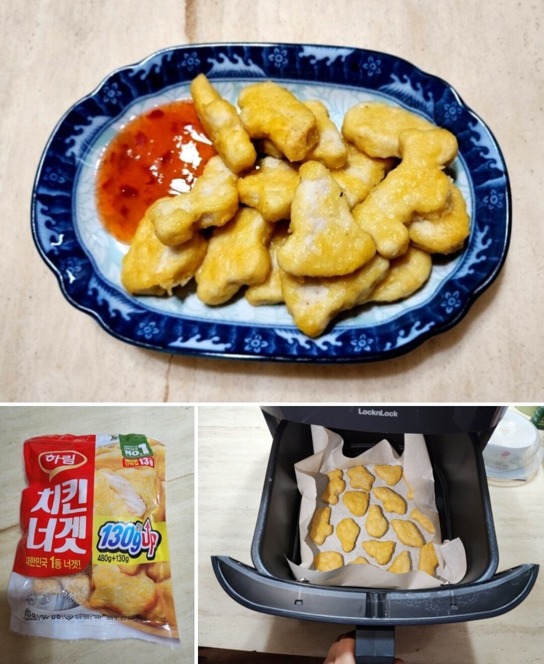 시판 냉동 너겟이니까 포장의 조리방법대로 190~200°C 예열로 6분 30초 수동설정해서 조리했다. 아주 촉촉하게 잘 익었다. 요리초보도 쉽게 다룰수 있을 것 같다.