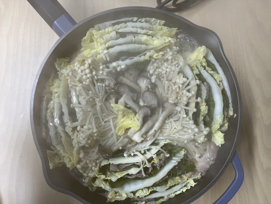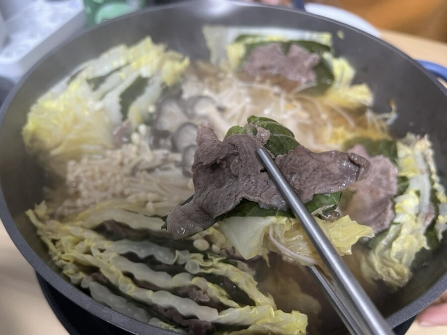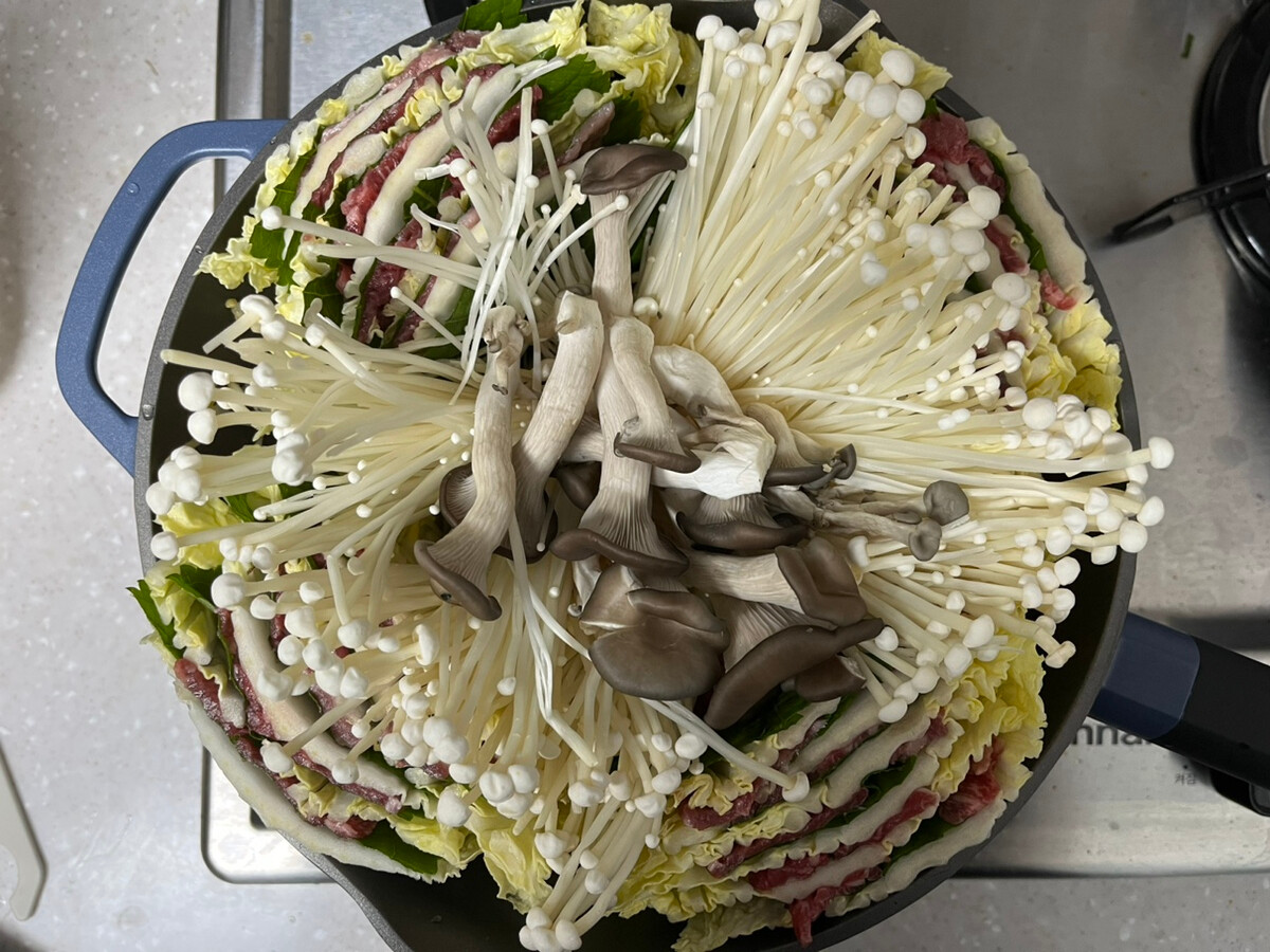 그 위에 알배추, 소고기, 깻잎을 겹겹이 쌓은 밀푀유나베!!