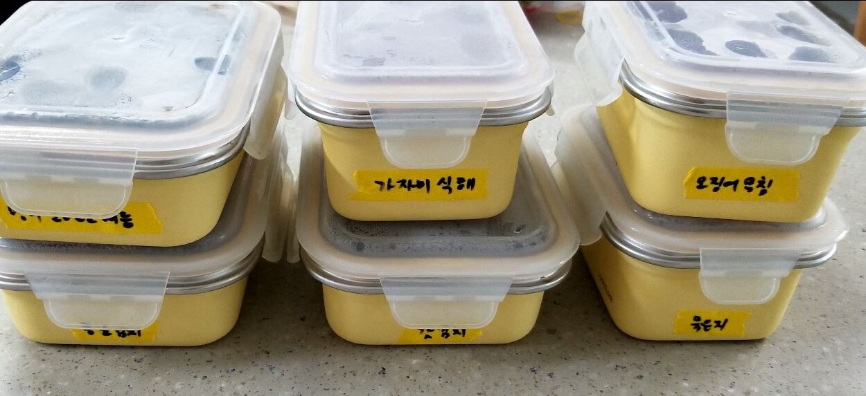 이 노란색 컬러스텐 밀폐용기들은 스텐레스 제품이어서 플라스틱보다 안전한 느낌이 들었어요.