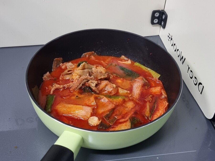 집에서 간단히 먹기 위해서 곱창전골을 끓였는데,