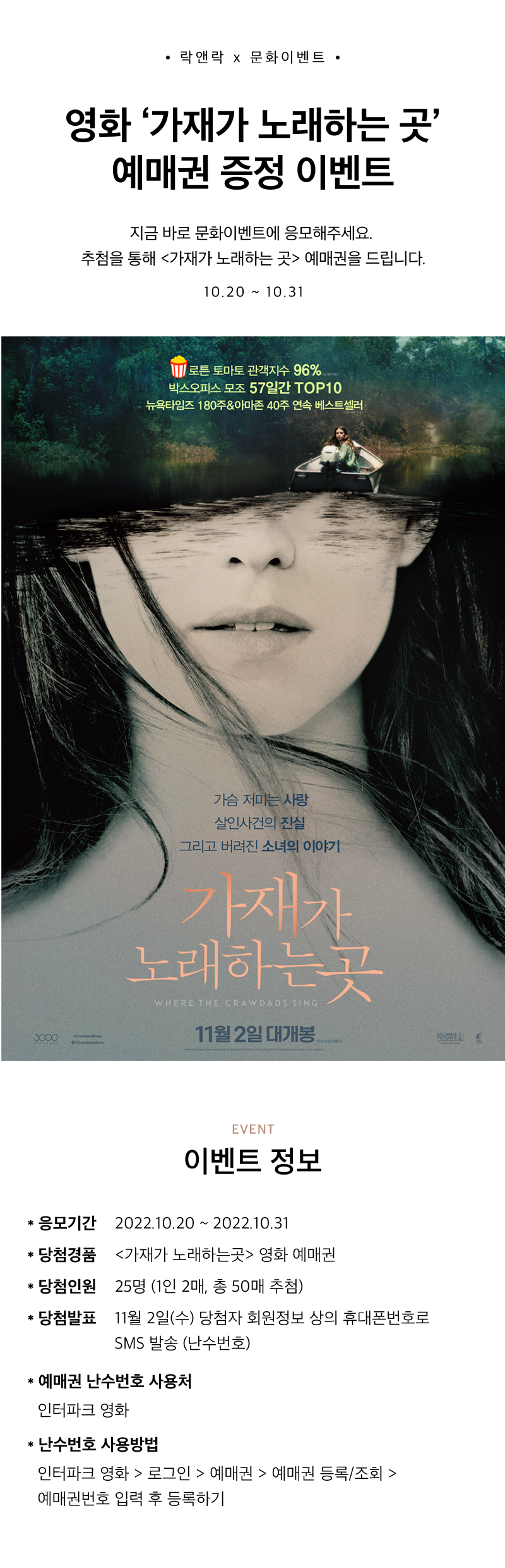 [락앤락x문화이벤트] 영화 '가재가 노래하는 곳' 예매권 증정 이벤트