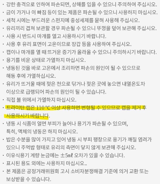 ㄴ안녕하세요 고객님 문의주신 제품 트라이탄 캡으로 110도 이상 사용하면 변형될 수 있는 점 안내드리고 있습니다.