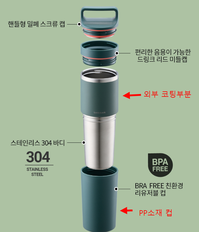 텀블러 위쪽만 외부 코팅 되어 있으며, 아래쪽 컵부분은 PP 소재로 안내드립니다.