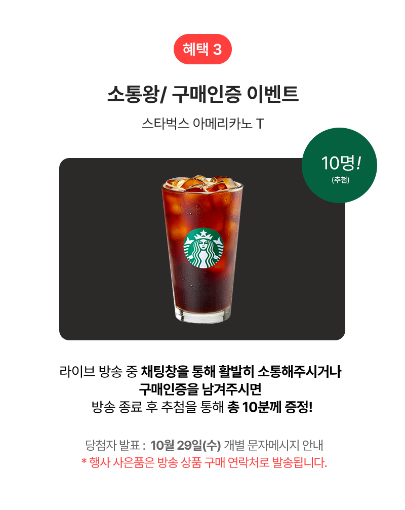 • 소통왕/구매인증 이벤트는 방송 중 댓글에 “구매인증“을 남겨주신 분과 댓글로 활발히 소통해주신분 중 추첨을 통해 10분께 [스타벅스 아메리카노T]을 안내된 일정에 증정합니다.